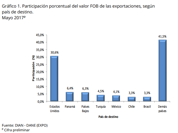 En mayo de 2017, Estados Unidos fue el principal destino de las exportaciones colombianas, con una participación de 30,6% en el valor FOB total exportado; le siguieron en su orden, Panamá, Países Bajos, Turquía, México, Chile y Brasil.