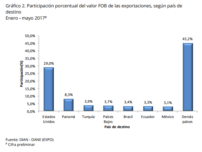 Estados Unidos fue el principal destino de las exportaciones colombianas en lo corrido del año hasta mayo de 2017, con una participación de 29,0% en el valor total exportado; le siguieron en su orden, Panamá, Turquía, Países Bajos, Brasil, Ecuador y México.